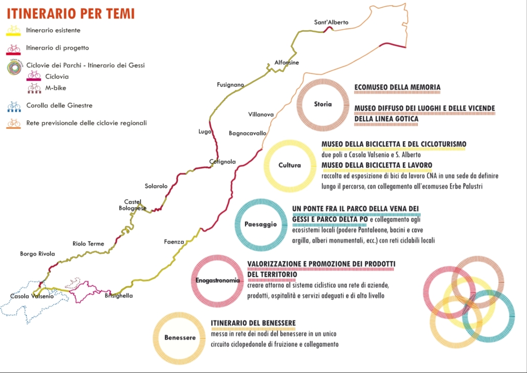 La credibilità dell’idea esposta – un percorso ciclo-naturalistico e della memoria del Senio, integrato con quello del Lamone, uniti dai parchi dei Gessi e del Delta, con sbocco al mare – è stata accreditata da quattro relazioni che gli hanno dato solide gambe motivazionali. La storia, la natura e il paesaggio, l’arte e la cultura, l’economia rurale rappresentano i puntelli al progetto. Progetto, infine, tracciato sulla carta da un esperto nazionale del settore che ne ha dimostrato la concreta fattibilità.