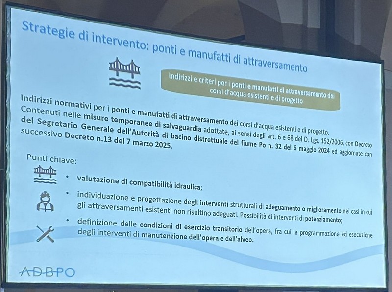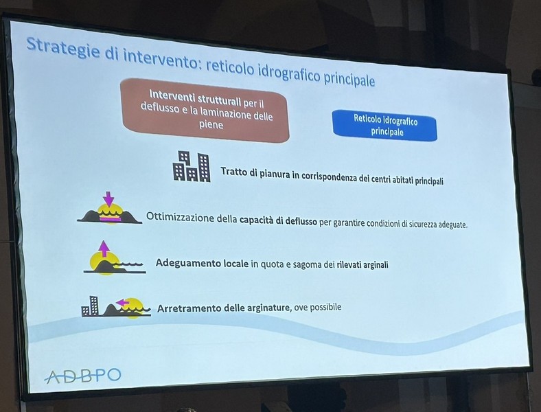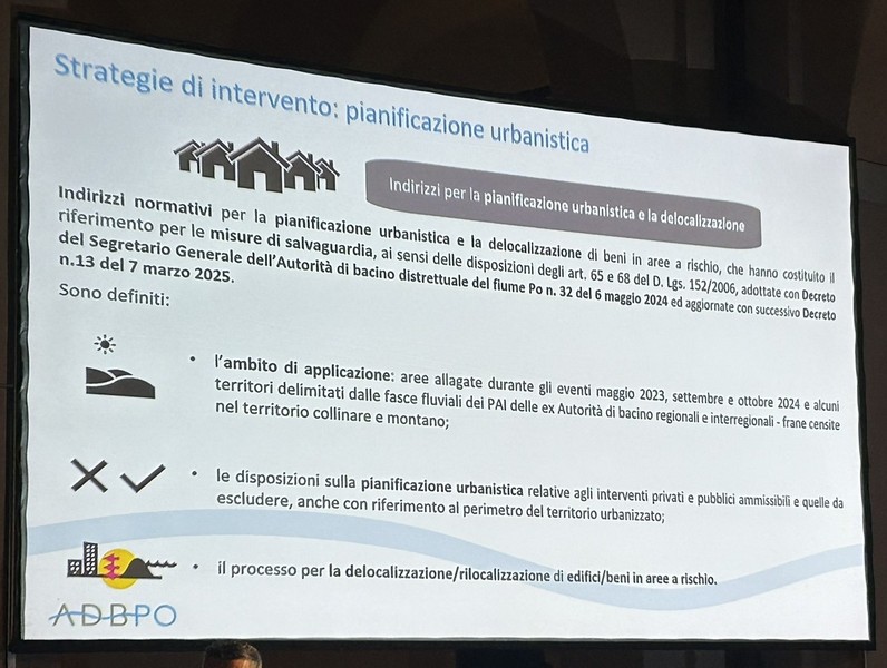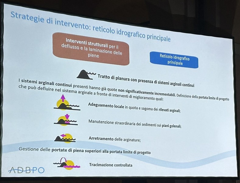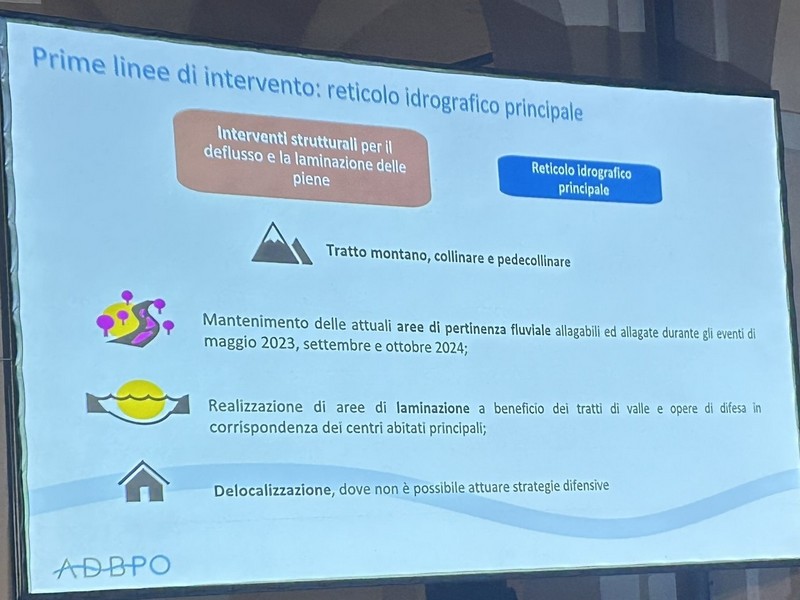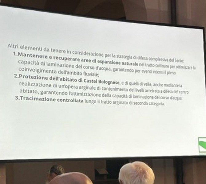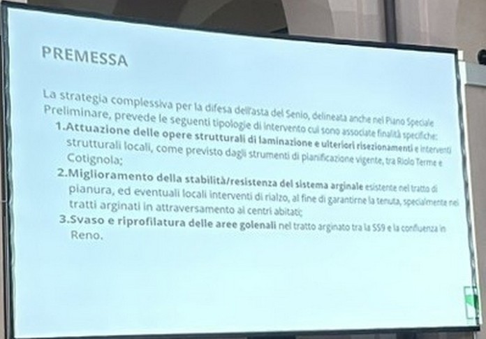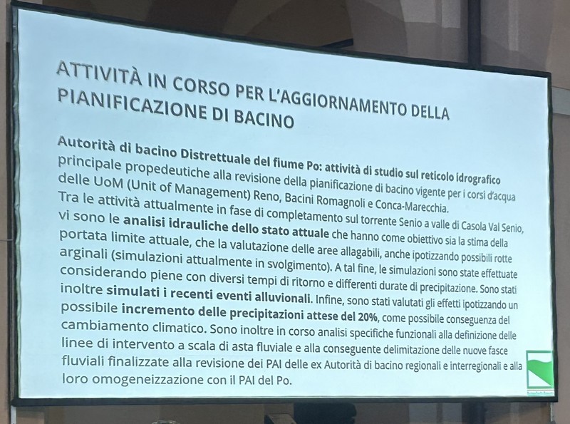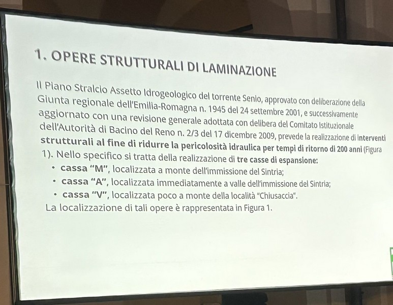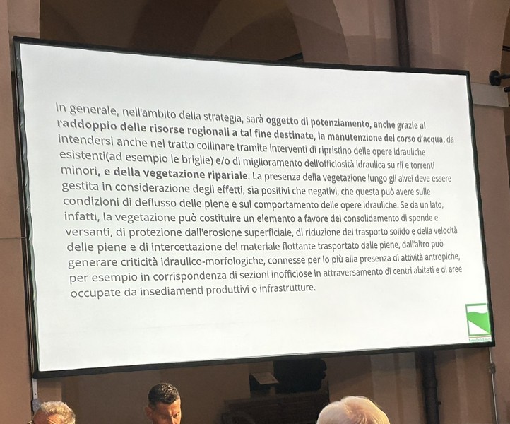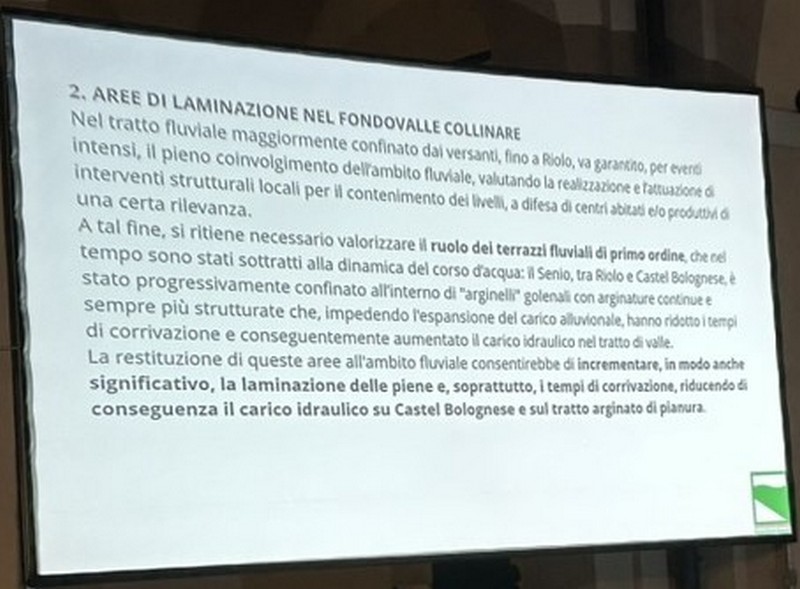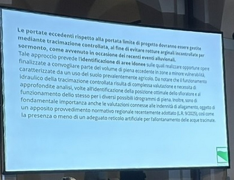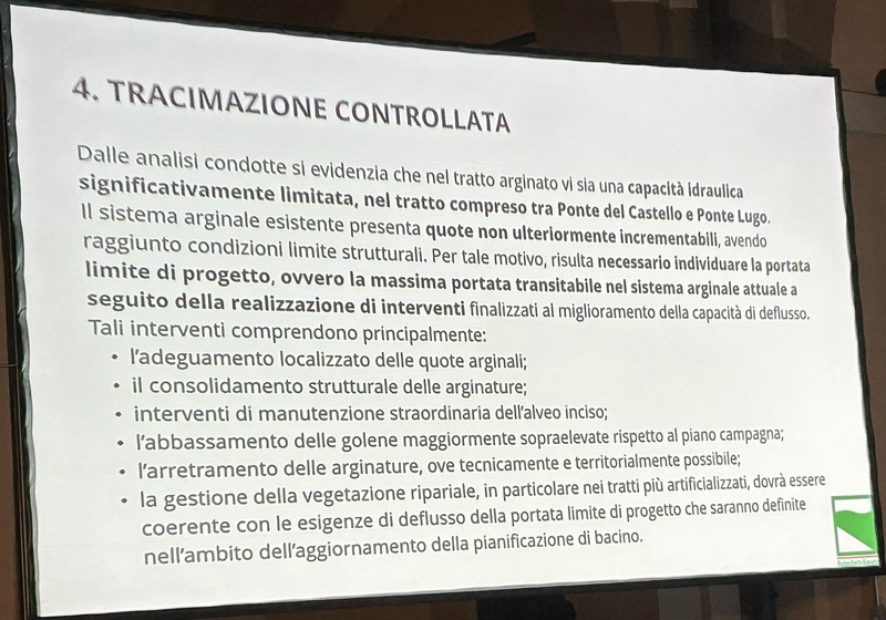 6 – Fra la Vena del Gesso e la via Emilia saranno previste aree di allagamento per 220 ettari di terreno storicamente alluvionale. Corrisponde al terreno che già il fiume si è preso con gli eventi del 2023 e 2024, più altro da definire. Questo significa, a mio parere – e come scritto nella slide che potete vedere sotto – che non debbono essere frapposti ostacoli a che, in caso di fiumane, l’acqua scorra in quei terreni. Questo significa la rimozione degli ostacoli eventualmente frapposti, se ho ben capito. Si definiranno le servitù di allagamento (come già avviene il Toscana e Veneto) che prevedono i necessari indennizzi ai proprietari dei terreni. Debbo rilevare che su questo punto non ho notato negli interventi dalla parte della Presidenza, perfetta sintonia. Sarà nostro carico chiedere i chiarimenti opportuni.