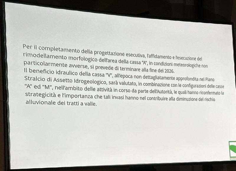 3 – Si prevede il completamento delle due casse di espansione di Cuffiano-Tebano entro il 2026. Su questo punto, però, non c’è ancora sufficiente chiarezza. Non è chiaro come si farà a mandare l’acqua verso l’alto – visto che è innaturale – nella cassa di Cuffiano (quella già realizzata da un decennio e che ancora non ha accolto nemmeno un litro di acqua del fiume). Non è chiaro quando debba entrare in funzione la cassa bassa (Tebano), visto che ha funzionato nel 2024, a fronte di un picco di fiumana molto alto, ma non ha funzionato – e non per poco – nel marzo 2025, con un picco meno alto, ma con l’acqua che ha raggiunto il Livello 3 (rosso) nei comuni della pianura.