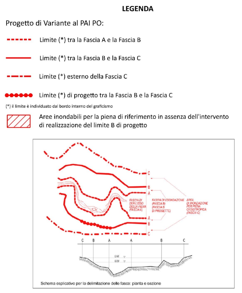 “L’argine golenale, nel tratto terminale tra la Bucaccia e Ponte del Castello, tanto in destra quanto in sinistra dovrà essere predisposto affinché, al transito dell’evento di riferimento, quota parte del volume di piena possa localmente tracimare senza indurre il crollo del rilevato. Il sistema andrà studiato in termini altimetrici affinché sia in grado di limitare la portata al colmo in ingresso al tratto arginato di pianura a 210 m³/s e, contestualmente, di minimizzare le esondazioni per eventi frequenti. Il tracciato planimetrico dell’arginatura golenale è rappresentato dal limite della fascia A. Si osservi che laddove il sistema arginale descritto manterrà tratti di rilevati esistenti, dovrà essere garantita l’adeguatezza strutturale di tali opere”.