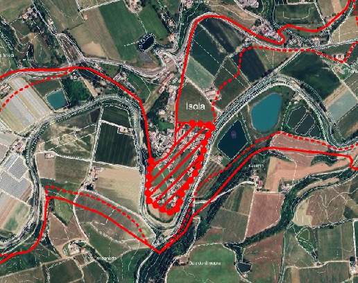 (Antolini) A difesa dell’Abitato di Isola è programmata, nella zona indicata con pallini rossi, un’opera di difesa. Il tipo di opera, muro o argine, sarà deciso nella fase di progetto; sempre in fase di progetto l’opera può essere oggetto di variazioni. Allego un estratto della tavola delle Fascie allagabili del Senio con legenda, dove si spiega che la fascia A è l’area più vicina al fiume, racchiusa dal tratteggio, soggetta alle piene “ordinarie”, mentre la fascia di esondazione B, racchiusa fra le linee continue, rappresenta l’area potenzialmente occupabile dal fiume durante le piene importanti.