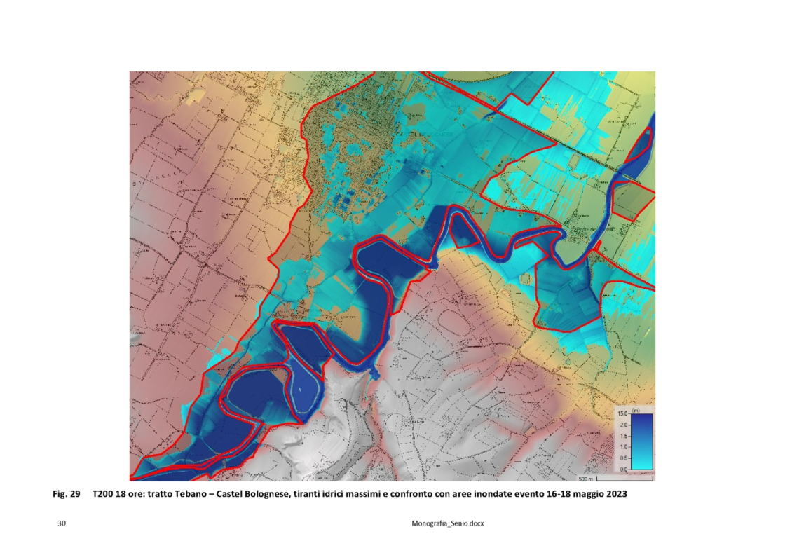 “Ricevuto il contributo del torrente Sintria, il Senio per l’evento T200 palesa l’inadeguatezza attuale del sistema difensivo di Castel Bolognese, con sormonti diffusi dalla derivazione del canale dei Mulini a Ponte del Castello. Gli areali coinvolti sono molto simili a quelli dell’evento 16-18 maggio 2023 (cfr. Fig. 29). Anche la propagazione dell’esondazione verso nord nord-est nei territori di Solarolo e Lugo è simile. Dal confronto tra gli idrogrammi a monte del ponte di Tebano e in ingresso al ponte della via Emilia è possibile stimare in circa 3.000.000 m³ il volume esondato.”