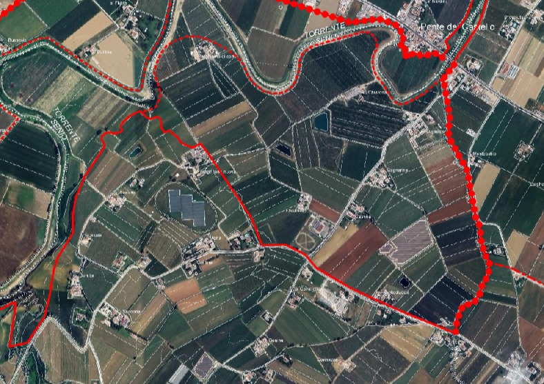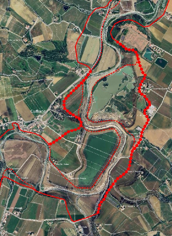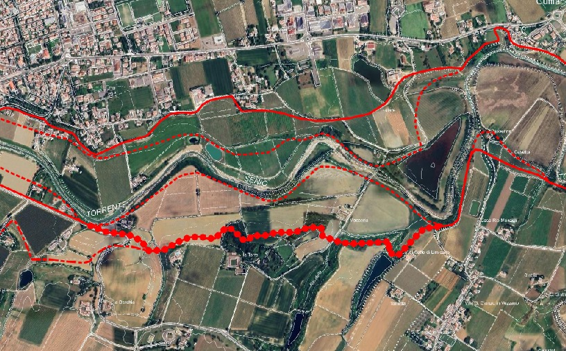 La linea con pallini indica un’opera di arginatura che dovrà essere costruita in sinistra e destra del Senio (limite di progetto tra la fascia B e la fascia C).