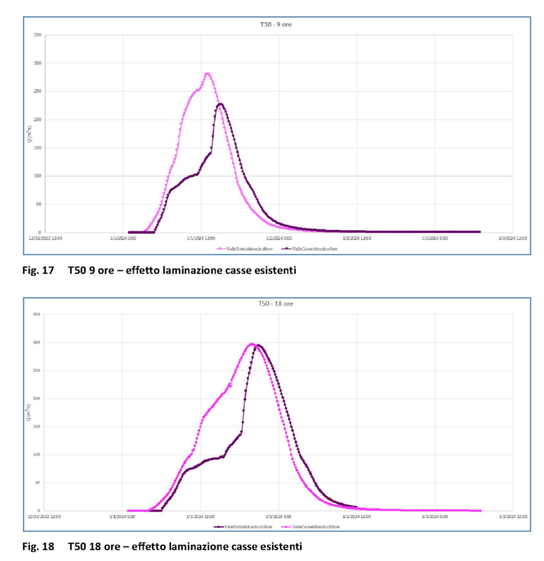 “L’effetto delle casse in località Cuffiano nella configurazione attuale, post sistemazioni conseguenti eventi 2023 e 2024, è rappresentata nell’immagine seguente (figura 17 e 18) per l’evento T50 di durata 9 e 18 ore. È palese come i volumi di eventi con durate di pioggia comprese tra 18 e 24 ore, critiche per il tratto a valle, confluenza con Sintria, siano tali da rendere inefficaci le opere esistenti: il colmo di piena transita sostanzialmente inalterato.”