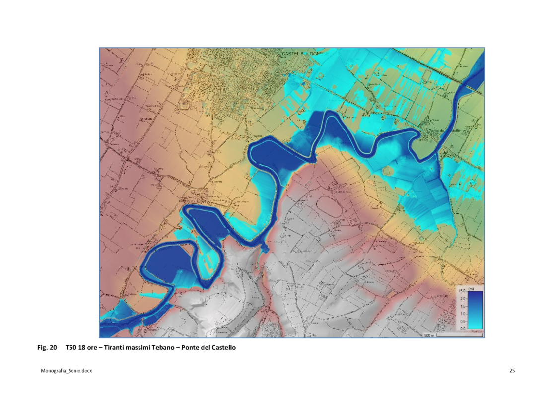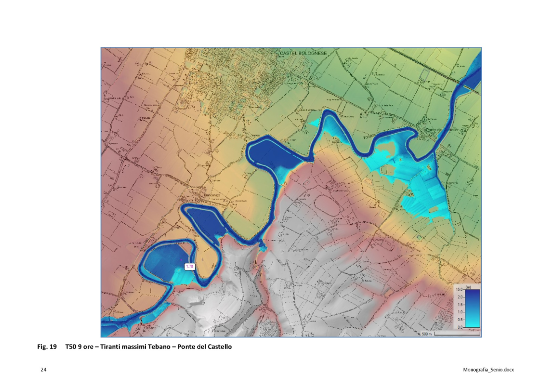 “Procedendo verso valle, a monte del ponte di Tebano, in corrispondenza della derivazione del canale dei Mulini e della confluenza rio del Torretto, inizia in sinistra il sistema difensivo arginale, oggi strategico per la difesa di Castel Bolognese. Nel tratto tra Tebano e Ponte del Castello, le durate di pioggia più severe sono comprese tra 18 e 24 ore. In Fig. 19 sono rappresentati i tiranti massimi per l’evento di durata di pioggia 9 ore; l’evento sollecita al massimo il sistema di ritenuta con locali sormonti tra via Burano e il ponte della SS9.